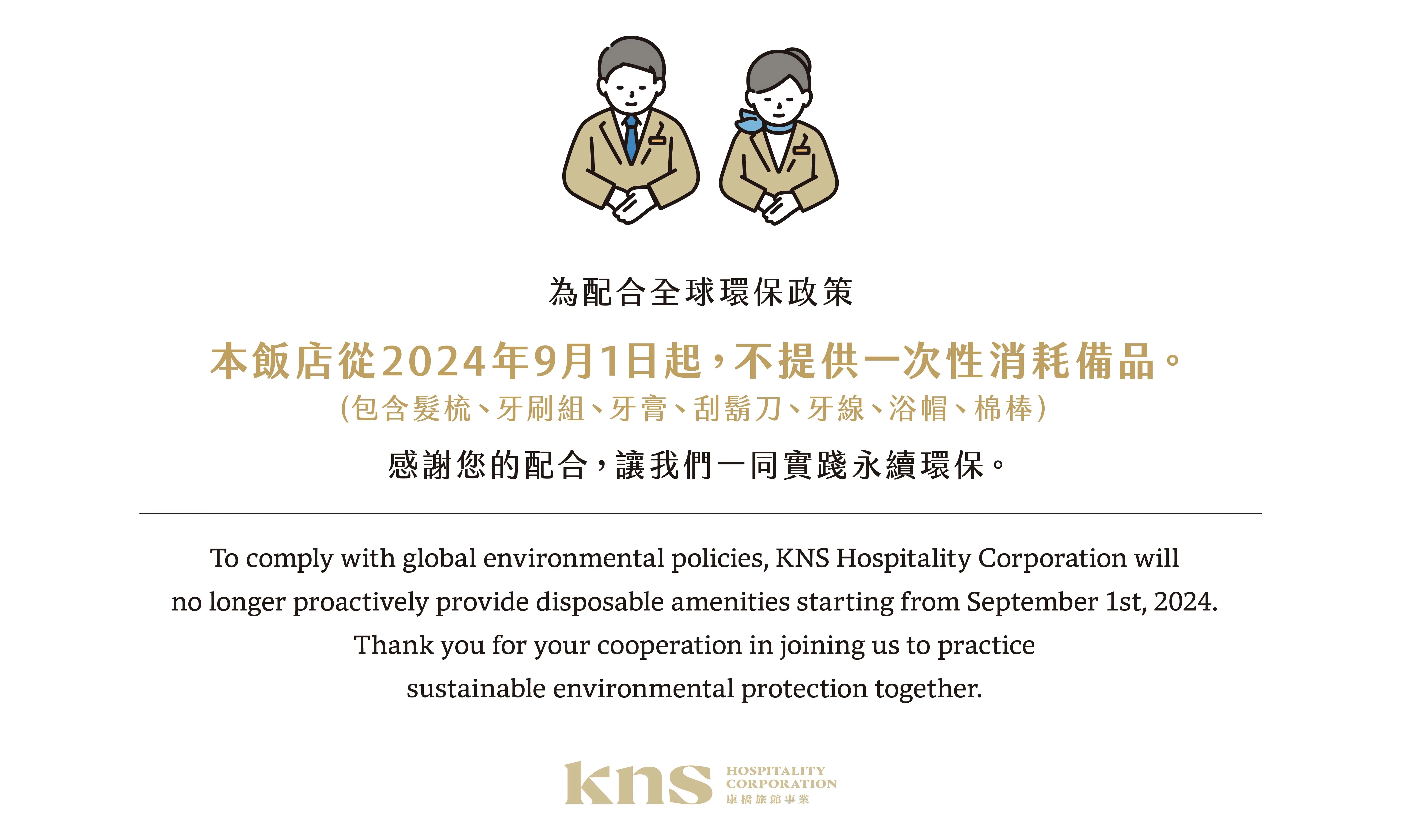 為配合全球環保政策,保護我們珍貴的地球和推動永續發展,自2024年9月1日起,KNS康橋旅館事業將不再提供一次性消耗備品(包含髮梳、牙刷組、牙膏、刮鬍刀、牙線、浴帽及棉花棒),這一措施是為了減少塑膠廢棄物對大自然的影響,並共同努力創造一個更美好的未來。