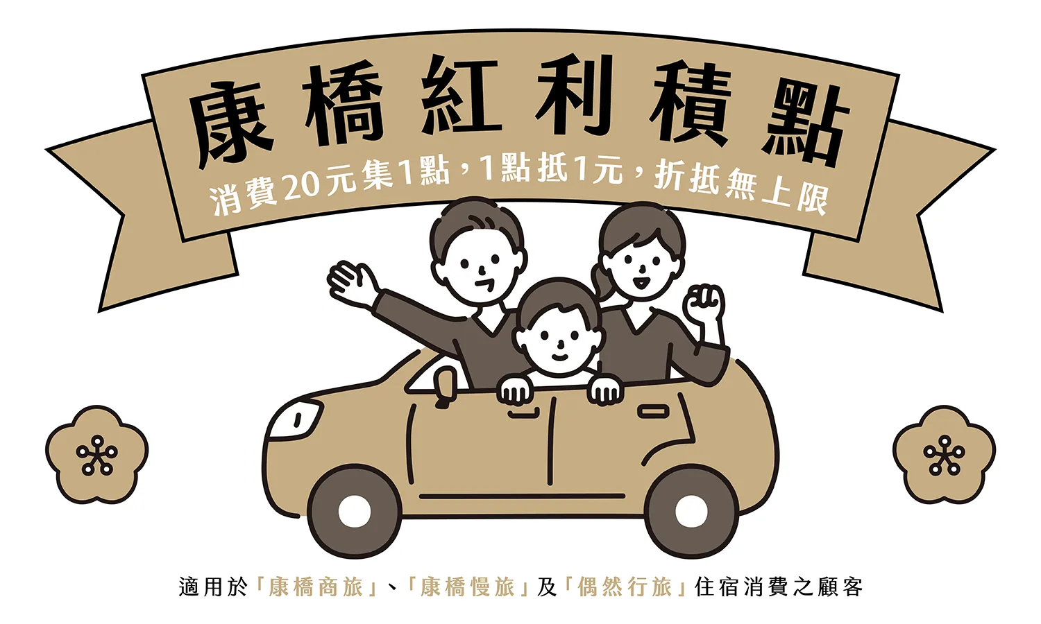 紅利點數折抵,限本人實際住宿或兌換康橋生活選品商品使用。