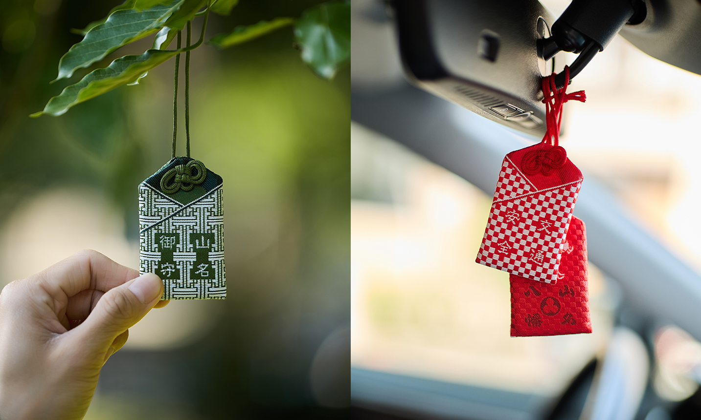 山名御守因端正而富有品格的氣質,自古深受武家喜愛,象徵家運昌盛與長壽。御守採用吉祥之意的沙綾紋樣,並以金線繡上山名家家紋—桐花與竹葉。整體配色取自桐花與竹葉的綠色,祝福旅人幸福、長壽和健康。